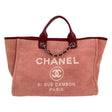 This is an authentic Chanel Large Deauville tote crafted of Tweed woven canvas in Red with red calfskin leather trim, signature embroidery at front, matching fabric interior lining and silver-tone hardware. Exterior Features: magnetic snap closure, two (2) threaded sliding chain straps and two (2) rolled leather top handles. Interior Features: open compartment, two (2) patch pockets, one (1) key ring and one (1) zip pocket.