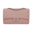This is an authentic Chanel Classic Medium Double Flap bag crafted of Quilted Lambskin leather in Light Pink with tonal leather trim, matching leather interior and silver-tone hardware. Exterior Features: CC turn-lock closure, one (1) patch pocket at back and sliding woven leather chain strap. Interior Features: fold over double flap, push snap closure, open compartment, two (2) zip pockets and three (3) patch pockets.