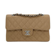 This is an authentic Chanel Classic Medium Double Flap bag crafted of Quilted Caviar leather in tan with matching leather interior lining and gold-tone hardware. Exterior Features: CC turn-lock closure, one (1) patch pocket at back and sliding woven leather chain strap. Interior Features: fold over double flap, push snap closure, open compartment, two (2) zip pockets and three (3) patch pockets.