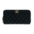 This is an authentic Chanel Boy Long Zip Wallet crafted of Quilted Caviar leather in Black with matching leather interior and champagne gold-tone hardware. Exterior Features: zip around closure. Interior features: eight (8) card slots, two (2) flat pockets and one (1) center zip pocket.