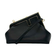 This is an authentic Fendi Small Fendi First Shoulder Bag crafted of calfskin leather in Black with matching leather trim, FF canvas interior lining and gold-tone hardware. Exterior Features: push snap closure and one (1) optional leather strap. Interior Features: open compartment.