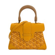 This is an authentic Goyard Mini Saigon Top Handle Bag crafted of Goyardine coated canvas in Yellow with matching leather interior, tonal leather trim and silver-tone hardware. Exterior Features: wooden top handle, belt strap closure, one (1) optional leather strap. Interior Features: open compartment and one (1) patch pocket.