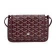 This is an authentic Goyard Plumet Pocket Wallet crafted of Goyardine coated canvas in Maroon red with matching calfskin leather trim, unlined cotton linen interior and silver-tone hardware. Exterior Features: press snap closure and one (1) optional leather shoulder strap. Interior Features: partitioned compartments, two (2) card slots and one (1) zip pocket at center.