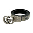 This is an authentic Gucci GG Marmont Reversible Belt crafted of GG Supreme coated canvas with navy blue grained leather trim and antique silver-tone Double G twist buckle. Size 95 (US 38).