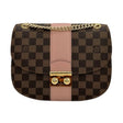 This is an authentic Louis Vuitton Wight crafted of Damier Ebene coated canvas with Rose Poudre pink leather trim, matching microfiber interior lining and gold-tone hardware. Exterior Features: S-Lock closure and sliding chain strap. Interior Features: open compartment, one (1) zip pocket and two (2) patch pockets.