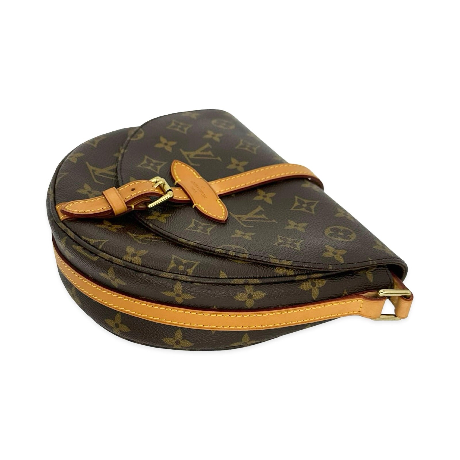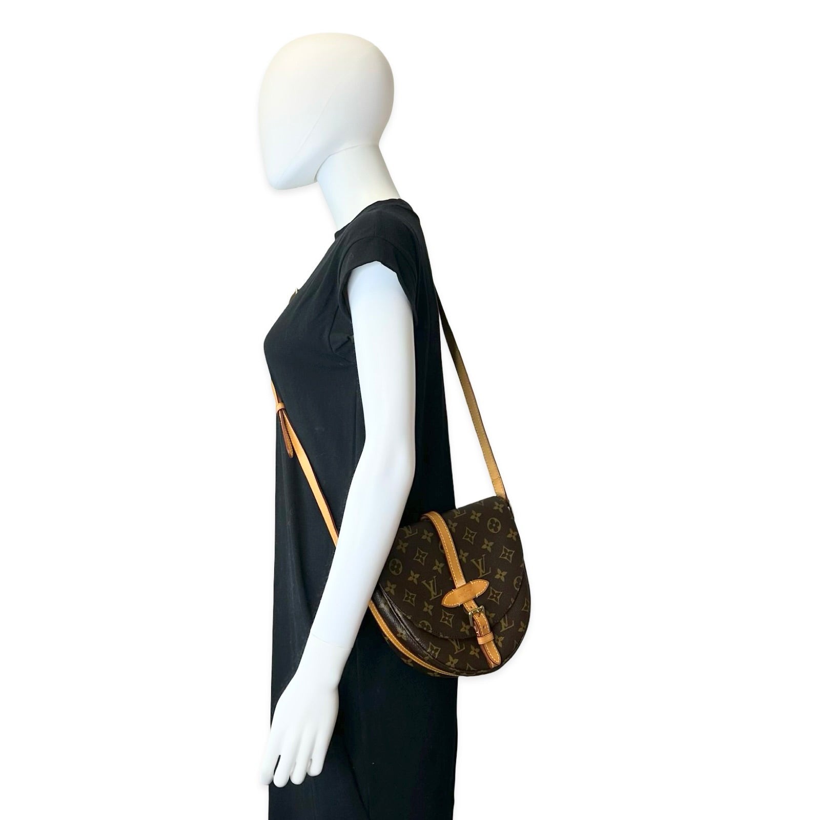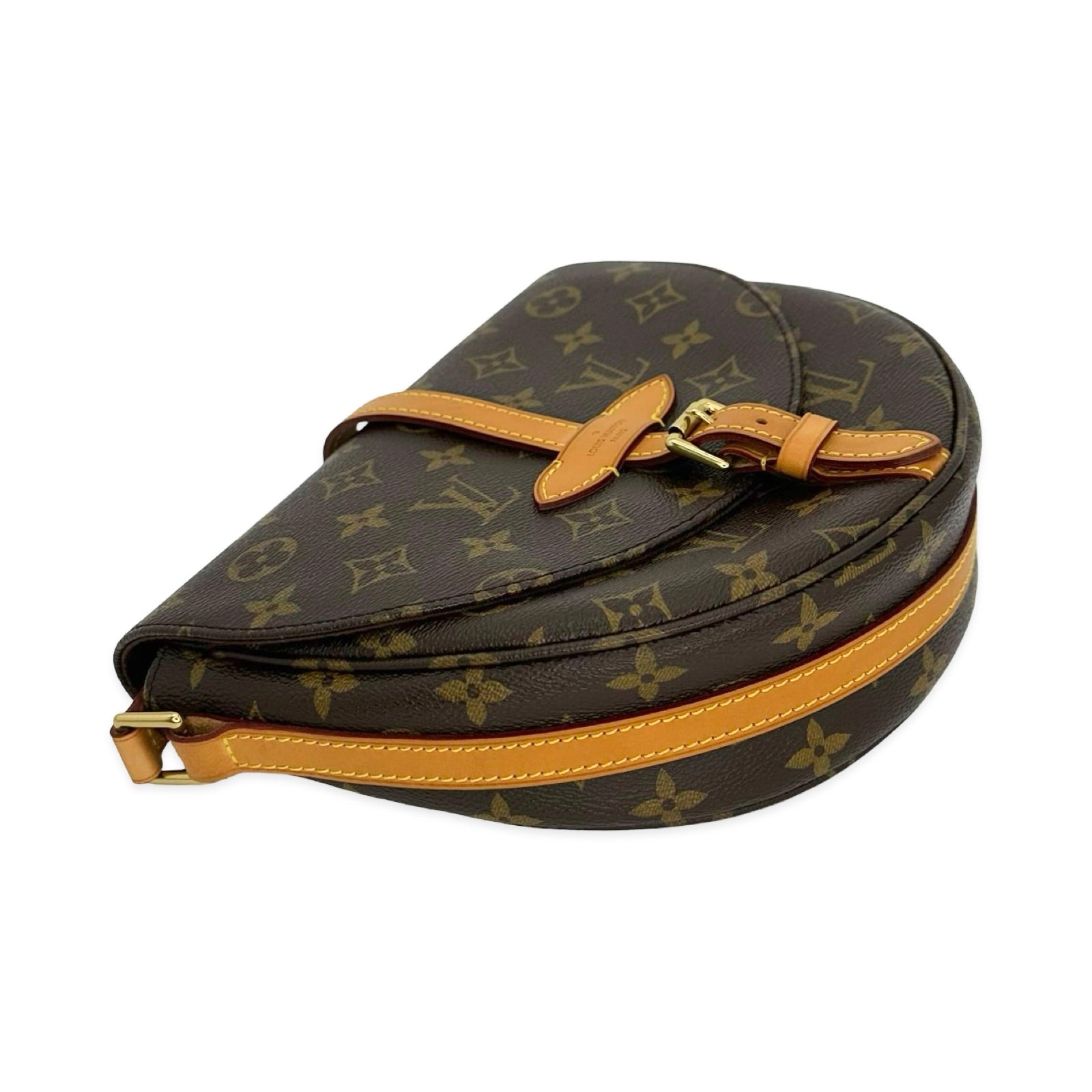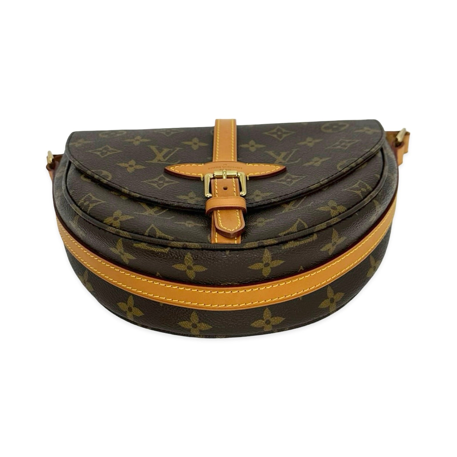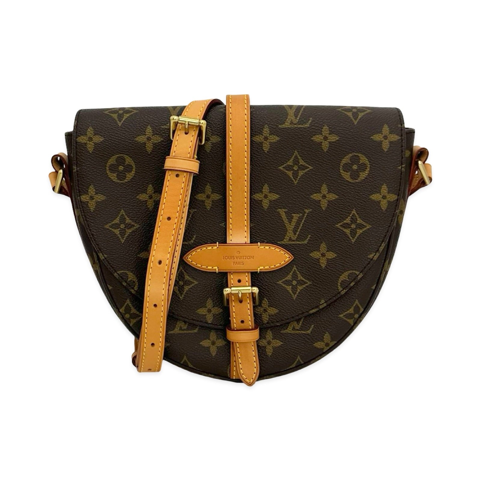 This is an authentic Louis Vuitton Chantilly Crossbody crafted of Monogram coated canvas with natural leather trim, brown fabric interior lining and gold-tone hardware. Exterior Features: Adjustable leather strap with strap pad and buckle closure. Interior Features: One (1) zip pocket and one (1) open compartment.