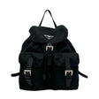 This is an authentic Prada Backpack crafted of Tessuto Nylon in black with matching Saffiano leather trim, silver-tone hardware and signature jacquard textile interior lining. Exterior Features: one (1) top handle, fold over flap, cinch closure, buckle closure, two (2) buckle pockets at front and two (2) adjustable nylon shoulder straps. Interior Features: open compartment and one (1) flat pocket.