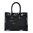 This is an authentic Saint Laurent Rive Gauche Tote crafted of mesh in black with signature applique at front, shiny black leather trim, matching leather interior and silver-tone hardware. Exterior Features: snap closure and four (4) snap tabs at sides. Interior Features: open compartment.