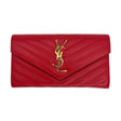 This is an authentic Saint Laurent Cassandre Large Flap Wallet crafted of chevron-quilted Grain de Poudre leather in Red featuring signature motif at front center, matching leather interior and gold-tone metal hardware. Exterior Features: snap closure. Interior Features: twelve (12) card slots, one (1) zip compartment and two (2) flat pockets.
