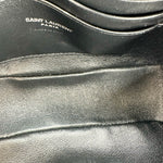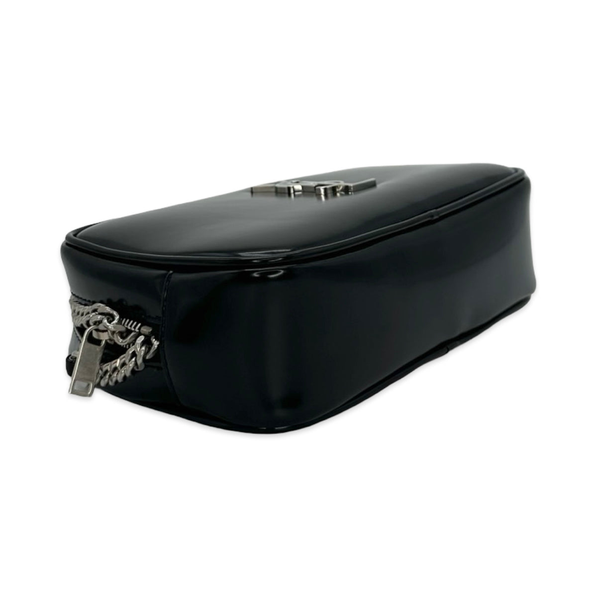 This is an authentic Saint Laurent Mini Lou Camera bag crafted of Patent leather in Black with matching leather trim, black leather interior and silver-tone hardware. Exterior Features: zip top closure, one (1) back slip pocket and chain shoulder strap with leather strap pad. Interior Features: open compartment and three (3) card slots.