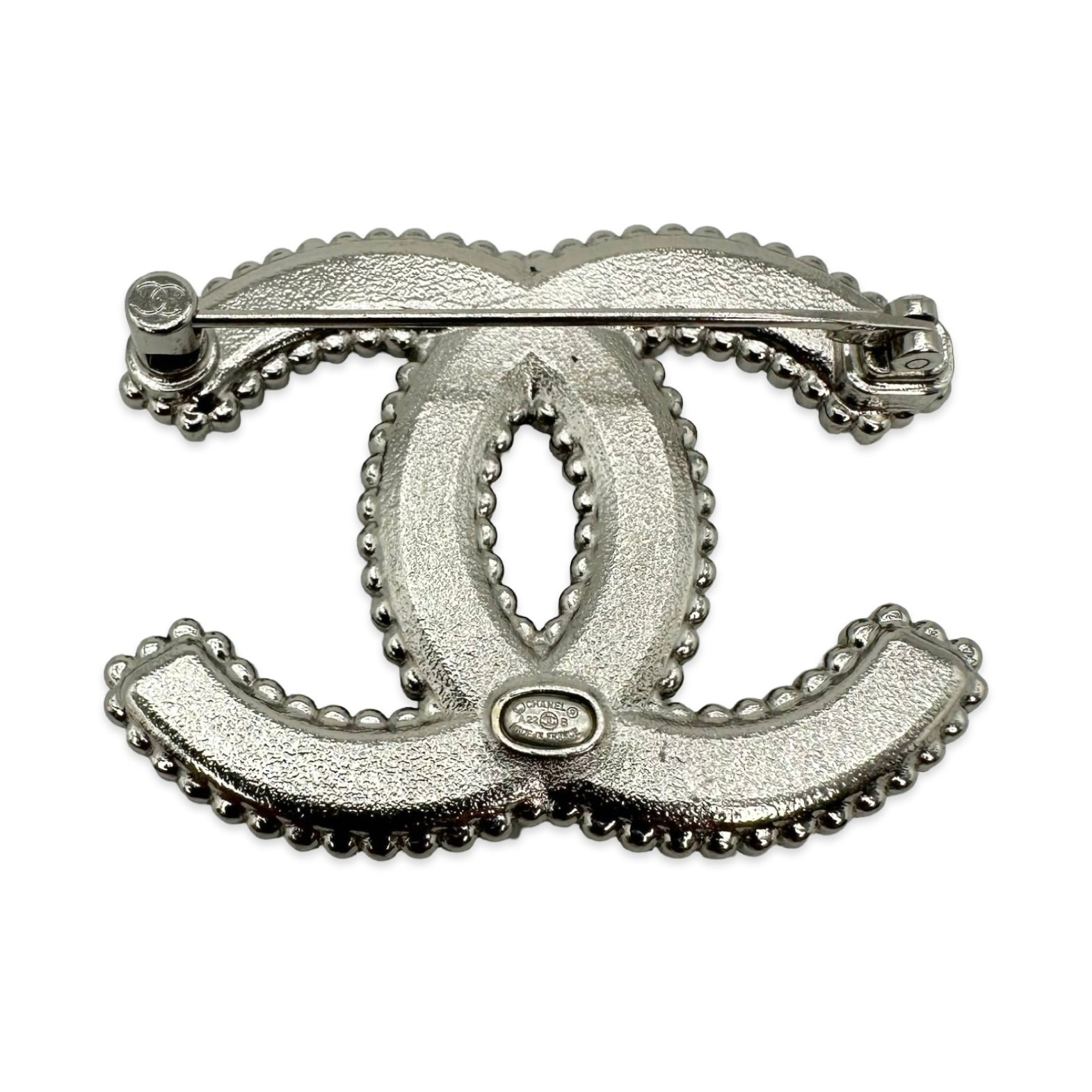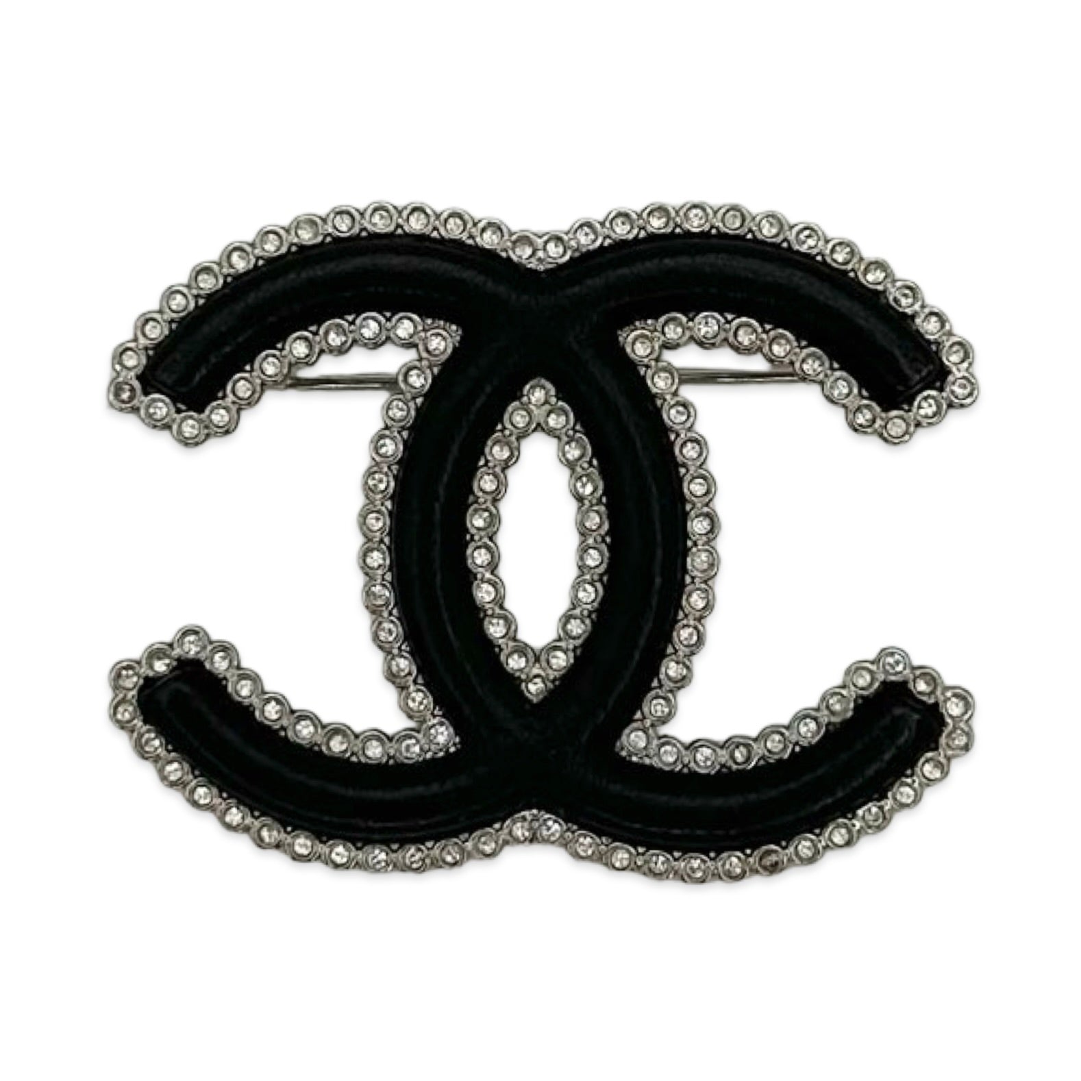Unit price / perThis is an authentic Chanel CC Crystal Leather Brooch crafted of silver-tone metal with crystal edge, black leather accents and a bar-pin fastening closure.