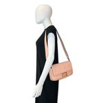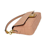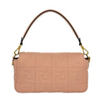 This is an authentic Fendi FF Baguette crafted of soft Nappa FF embossed leather in light pink with black textile interior lining and gold-tone hardware. Exterior Features: flap magnetic closure, one (1) optional chain strap and one (1) optional handle strap. Interior Features: open compartment and one (1) flat pocket.