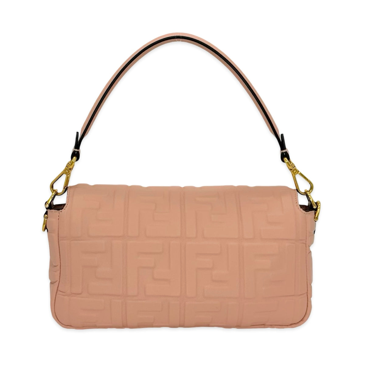 Unit price / perThis is an authentic Fendi FF Baguette crafted of soft Nappa FF embossed leather in light pink with black textile interior lining and gold-tone hardware. Exterior Features: flap magnetic closure, one (1) optional chain strap and one (1) optional handle strap. Interior Features: open compartment and one (1) flat pocket.