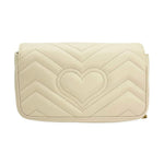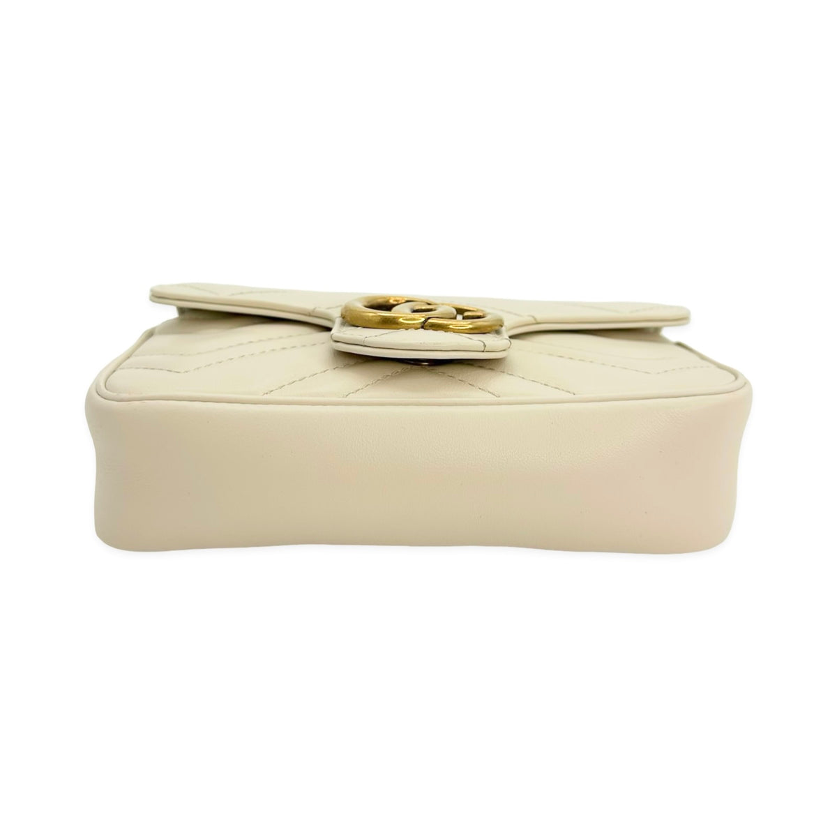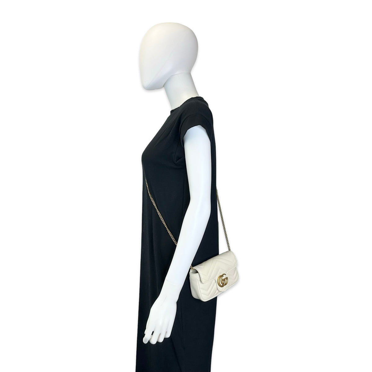 This is an authentic Gucci Super Mini GG Marmont Chain Bag crafted of Diagonal Quilted calfskin leather in cream with matching leather trim, beige microfiber interior lining and gold-tone hardware. Exterior Features: press-stud closure and optional chain shoulder strap. Interior Features: open compartment with removable key chain hook.
