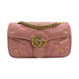 This is an authentic Gucci Torchon Medium Studded GG marmont Flap Chain Shoulder Bag crafted of Quilted Calfskin Leather in Pink with matching microfiber interior lining and gold-tone hardware. Exterior Features: flap top, push lock closure, sliding chain with leather shoulder pad and double GG hardware at front center buckle. Interior Features: open compartment and one (1) zip pocket.