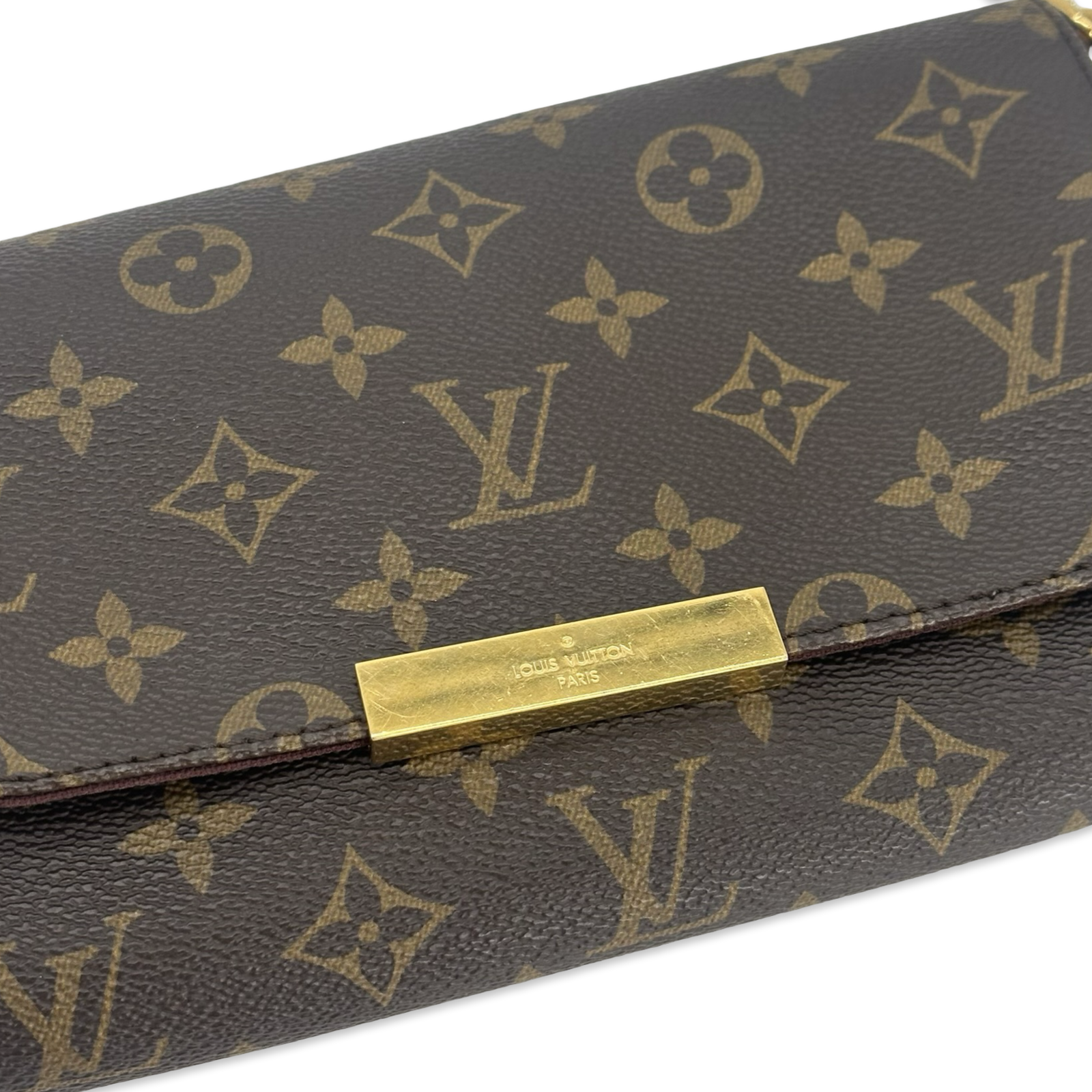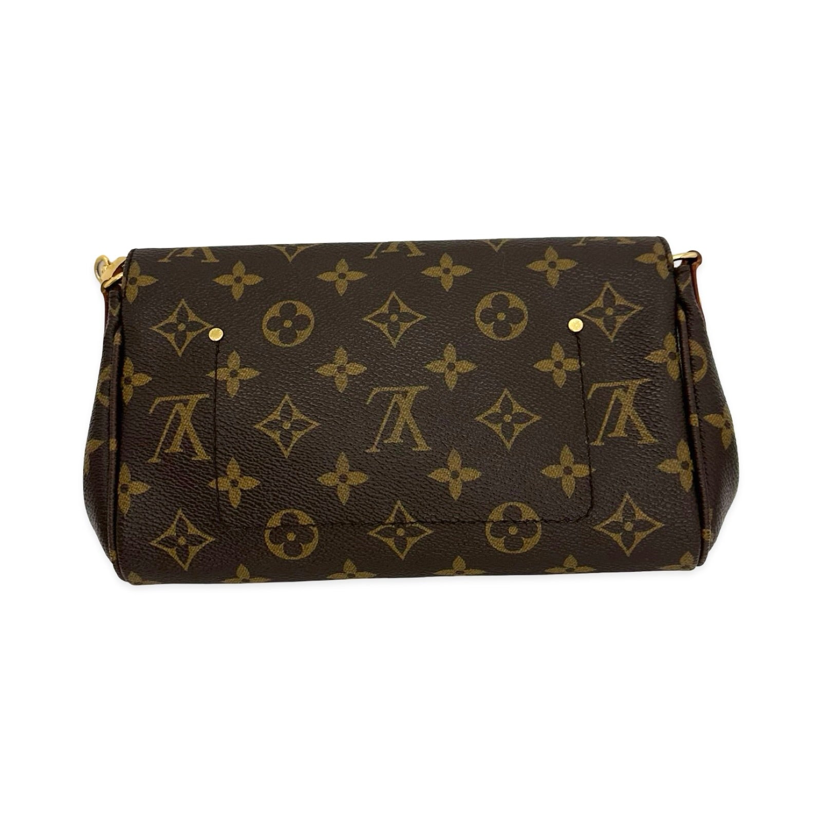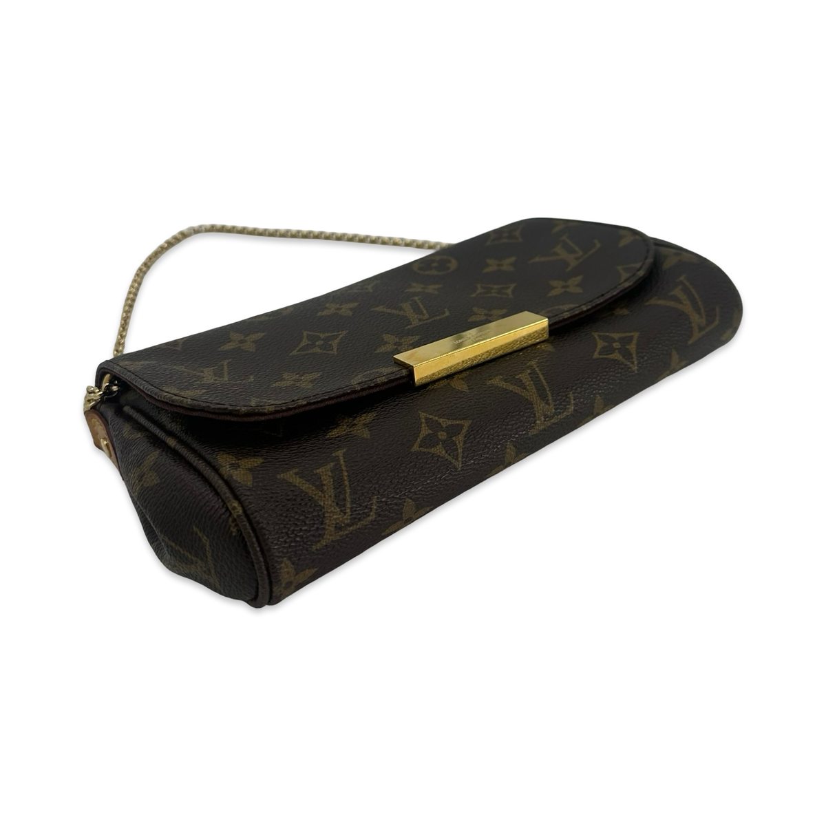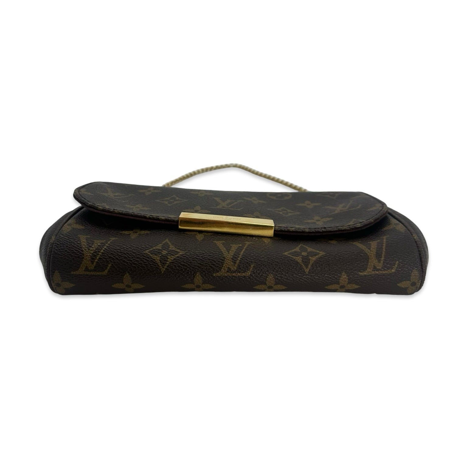 This is an authentic Louis Vuitton Favorite PM crafted of Monogram coated canvas with wine fabric interior lining, natural leather trim and gold-tone hardware. Exterior Features: Gold-tone chain strap and optional brown leather shoulder strap and secure magnetic closure. Interior Features: One (1) flat pocket and one (1) open compartment.